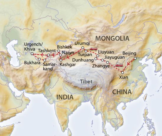 Die Seidenstrasse - erleben Sie eines der legendärsten Reiseziele der Welt! Auf den Spuren Marco Polos reisen Sie auf der Seidenstrasse durch schier endlose Sandwüsten, vorbei an gewaltigen Hochgebirgen, zu einsamen Oasen und exotischen Karawansereien. Schon vor 2'000 Jahren wurden diese Handelswege genutzt. Der deutsche Geograf Ferdinand von Richthofen gab erst Mitte des 19. Jahrhunderts der Karawanenstrasse ihren Namen "Seidenstrasse". Mit Ihrer privaten Reiseleitung, unterwegs in modernen Fahrzeugen, erleben Sie eine einmalige Landschaft, grandiose Kulturzeugnisse und interessante Menschen.