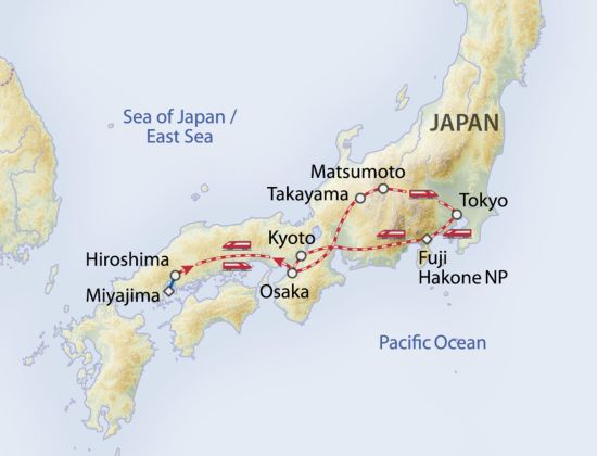<ul><li>Historisches Viertel Tokios</li><li>Kulinarische Tour durch Ginza</li><li>Malerischer Fuji Hakone NP</li><li>Kulturelle Höhepunkte Kyotos</li><li>Traditionelle Teezeremonie</li><li>Facettenreiches Osaka</li><li>Idyllische Insel Miyajima</li><li>Historisches Hiroshima</li><li>Charmantes Takayama</li><li>Imposante Burg Matsumotos</li></ul>