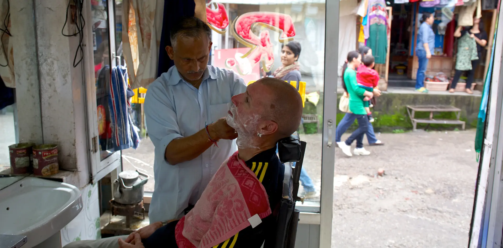 À McLeod Ganj (Dharamsala), la maison du dalaï-lama en exil, je trouve « mon » coiffeur dans les rues étroites.