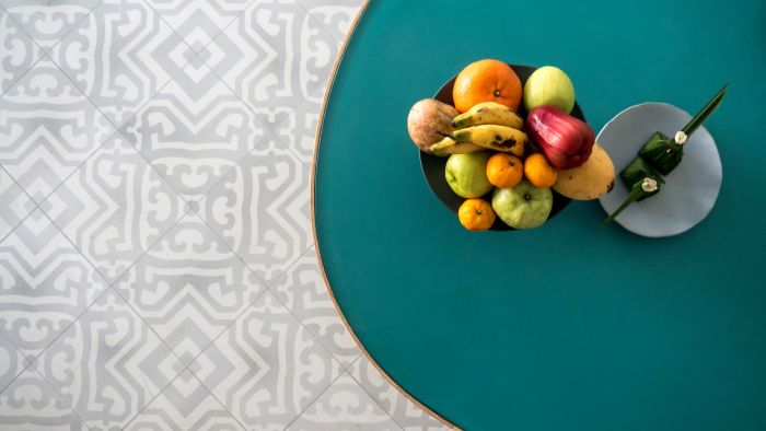On frappe à la porte. C’est un autre concierge qui, pendant tout notre séjour, nous apportera quotidiennement une assiette colorée de fruits tropicaux: un fruit de la passion, deux sortes de mandarines, des mini-bananes, une goyave – et un paprika rouge? Google nous apprend qu’il s’agit en réalité d’une pomme de Java, à la pulpe sucrée et juteuse. Nous la mangeons avec la peau – un véritable délice.