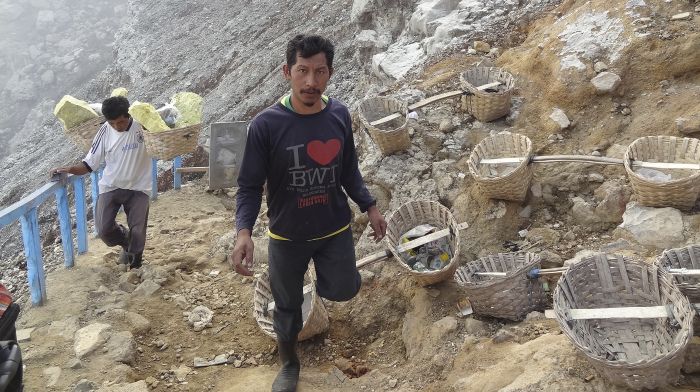 En route, nous croisons des mineurs locaux qui descendent deux fois par jour au village avec le précieux soufre. L’un des travaux les plus durs au monde ! La vapeur de soufre, que ces hommes respirent chaque jour, est hautement toxique et dangereuse. Certains, chaussés de simples tongs, sans eau ni nourriture, transportent sur leur dos écrasé des charges d’au moins cent kilos.