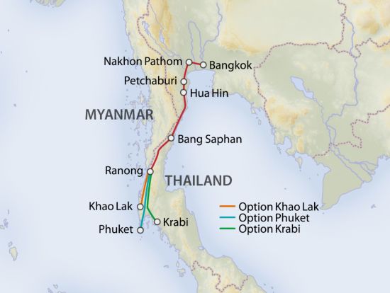 Ce circuit vous emmène de la trépidante Bangkok vers le sud tropical avec ses plages au sable clair et ses imposantes formations calcaires émergeant de l'eau. En cours de route, vous aurez l'occasion de découvrir les parcs nationaux, les sanctuaires troglodytes et l'archipel de rêve du sud de la Thaïlande.