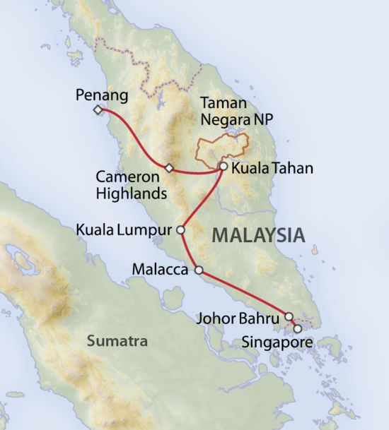 Grâce à son réseau routier très développé, la Malaisie offre des conditions idéales pour parcourir le pays individuellement au volant de sa propre voiture de location. Cet itinéraire varié vous permet de découvrir de votre propre chef une grande partie de la péninsule malaise – des villes coloniales et des métropoles modernes à l'île tropicale de Penang, en passant par les forêts tropicales et les hauts plateaux. Vous profitez de la liberté d'organiser vos journées comme bon vous semble tout en bénéficiant du confort d'hôtels réservés à l'avance le long du parcours.